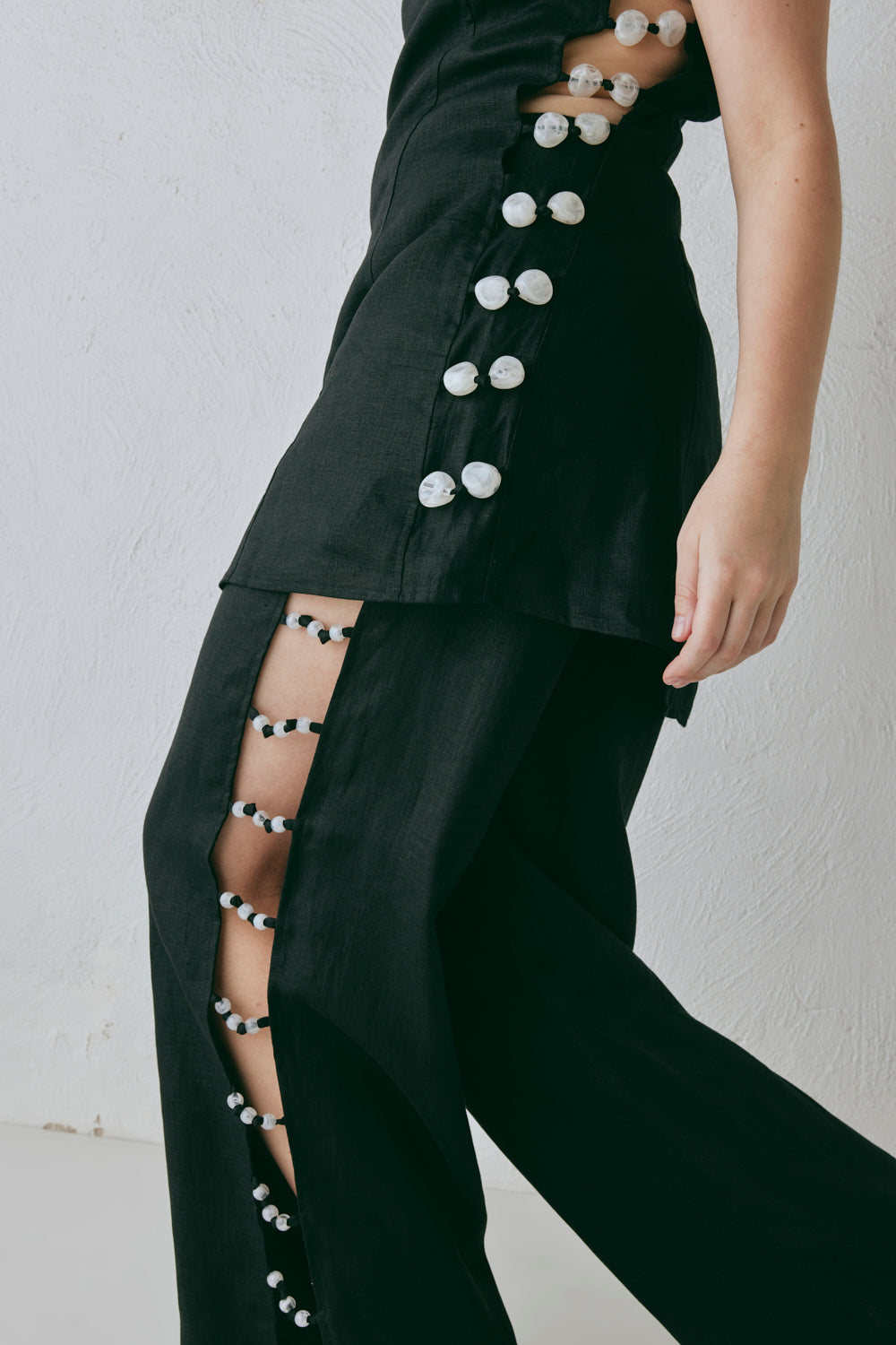 The Tia Mini Dress in Black is cut from 100% linen in a clean A-line shape with bead-trimmed side cut-outs and a low scoop back. Finished with a centre zip, it's designed to skim the body while still feeling effortless. Wear it solo or layer over the matching pants… not quite your standard dress code.
